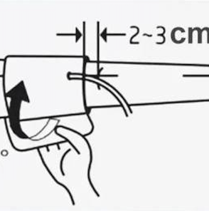 Крок 1Згідно з малюнком, натягніть нарукавну повʼязку на руку, яку потрібно вимірювати. Переконайтеся, що нижній край нарукавної пов’язки знаходиться на відстані більше 2-3 см від ліктьового згину, а повітряне сопло знаходиться на внутрішній стороні руки.