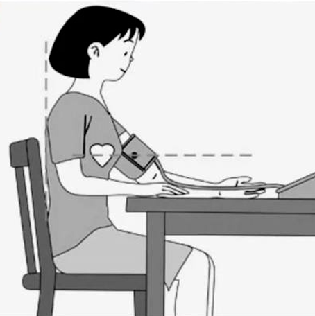 Крок 2Посидьте тихо 5 хвилин перед вимірюванням, як показано на малюнку, покладіть нижню руку прямо на стіл долонею вгору та сядьте прямо.